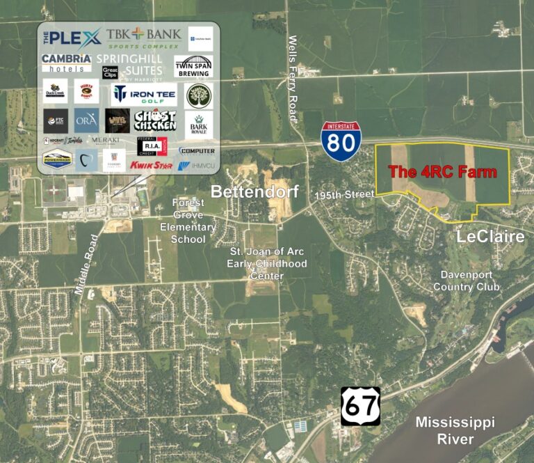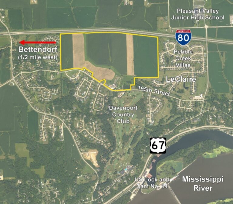 The subject farm is located approximately 10 1/2 miles northeast of Quad Cities International Airport and is contiguous to LeClaire. Nearby cities include: Bettendorf (1/2 mile west), Princeton (4 1/2 miles northeast), and Moline (5 1/2 miles south).