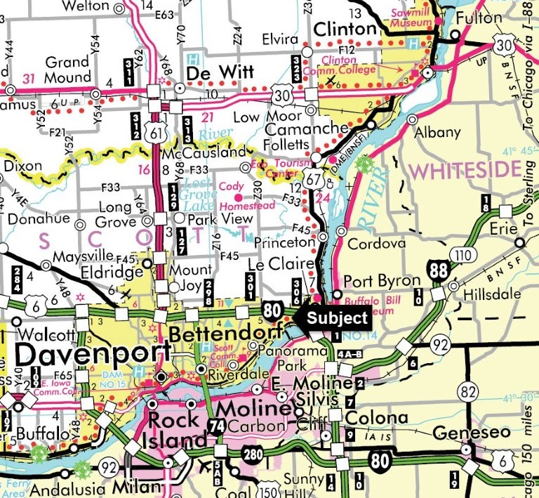 Interstate 80 is the north border of the property, U.S. Route 67 is 5/8 mile southeast, and Interstate 74 is 5 3/8 miles west of the property.