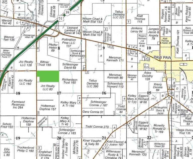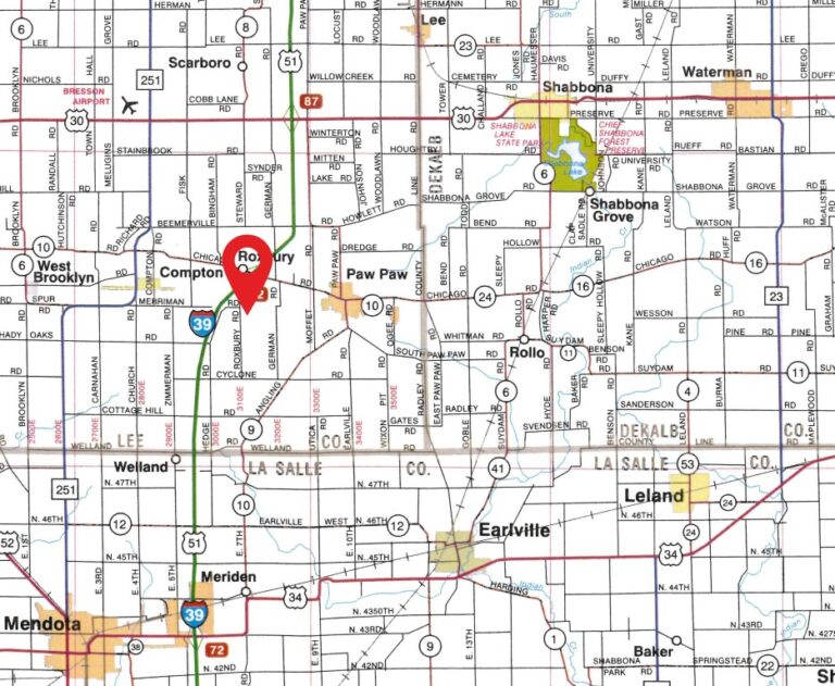 The subject farm is located approximately 60 miles southwest of Chicago O'Hare International Airport. Nearby cities include: Paw Paw (1 3/4 miles east), Mendota (7 3/8 miles south), and Shabbona (8 1/8 miles northeast).