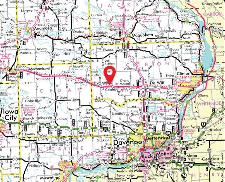 The subject farm is located approximately 30 miles northwest of Quad Cities International Airport. Nearby cities include: Calamus (3/4 mile southeast), DeWitt (11 miles east), and Davenport (17 miles southeast).